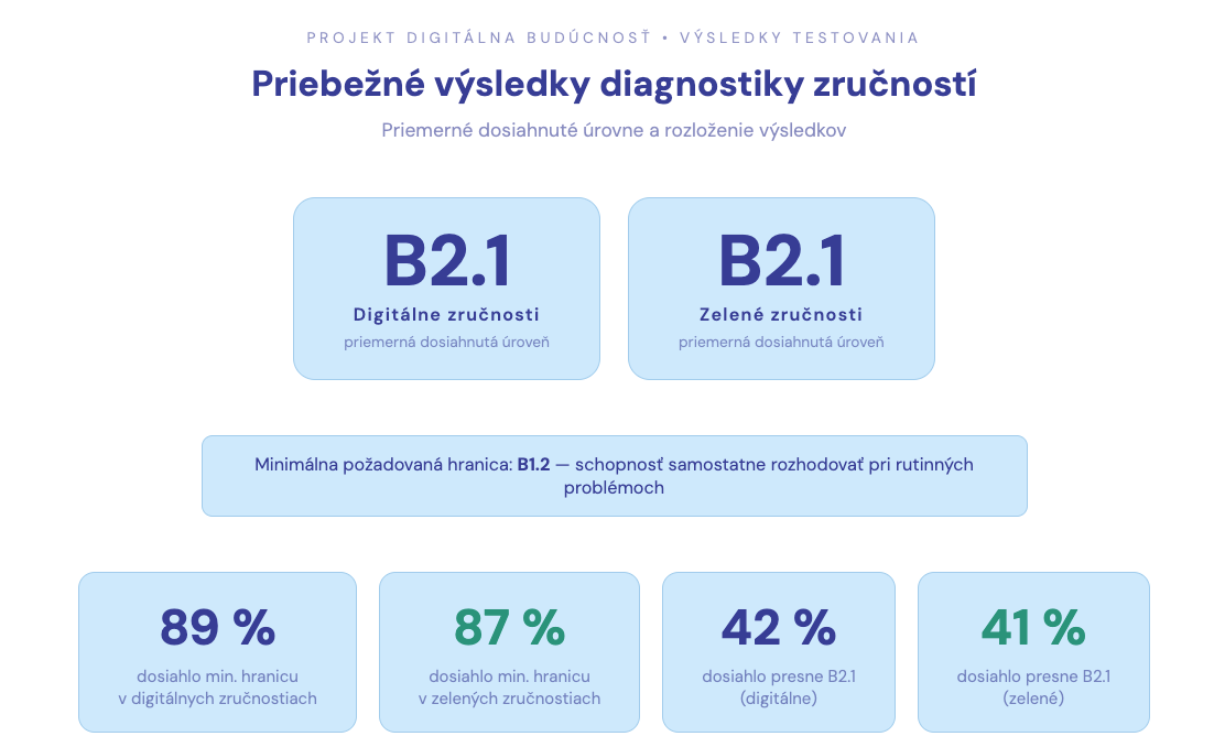 Najdôležitejší sumárny ukazovateľ tohto testovania je jednoznačný: priemerná dosiahnutá úroveň je B2.1 — rovnako pre digitálne aj zelené zručnosti.